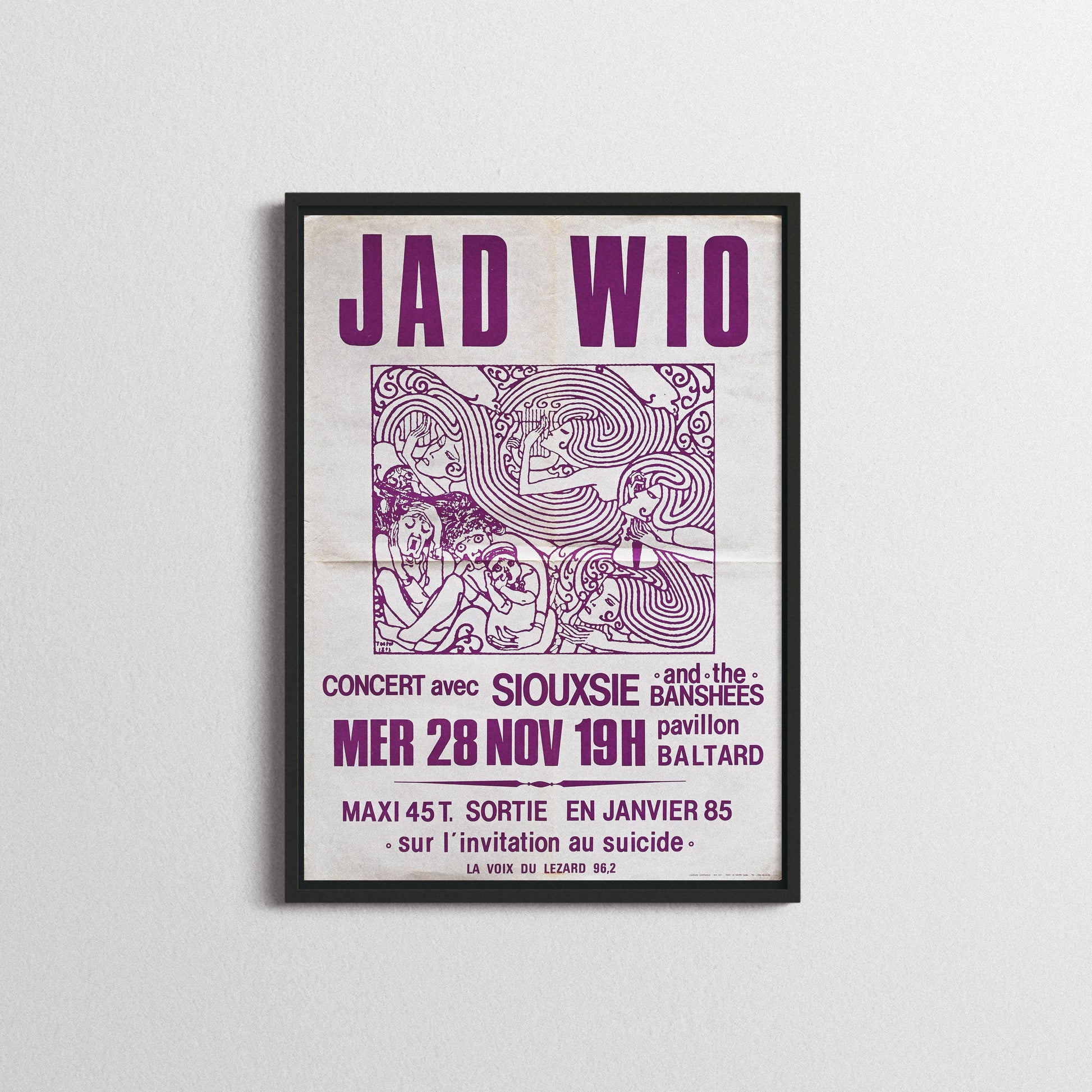 Figure majeure de la scène rock alternatif et cold wave française, Jad Wio se distingue par ses performances excentriques, mêlant surréalisme et satire. En 1984, le groupe partageait l’affiche avec des formations influencées par la new wave britannique, comme Siouxsie & The Banshees. Leur musique, à la fois sombre et flamboyante, illustre parfaitement l’esprit underground et créatif de la scène française de l’époque.