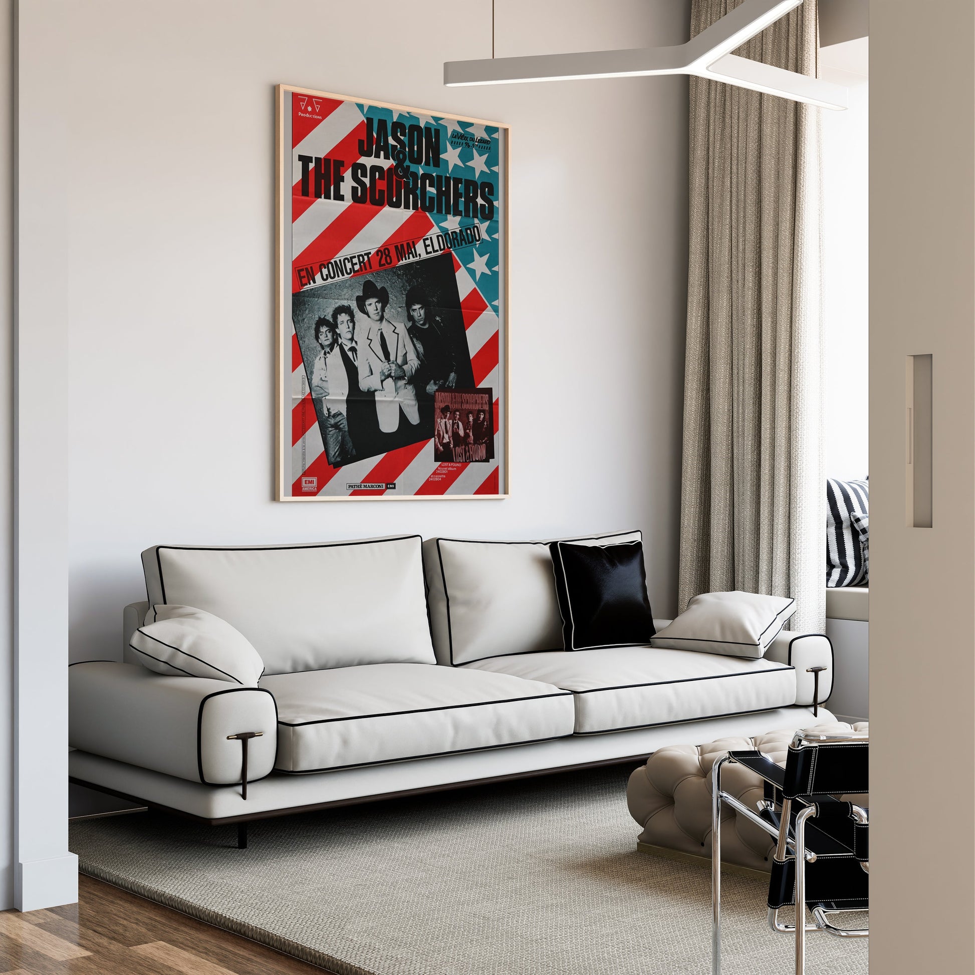 Revivez l’énergie explosive du cowpunk américain avec cette affiche originale du concert de Jason & The Scorchers à l’Eldorado en 1985.
