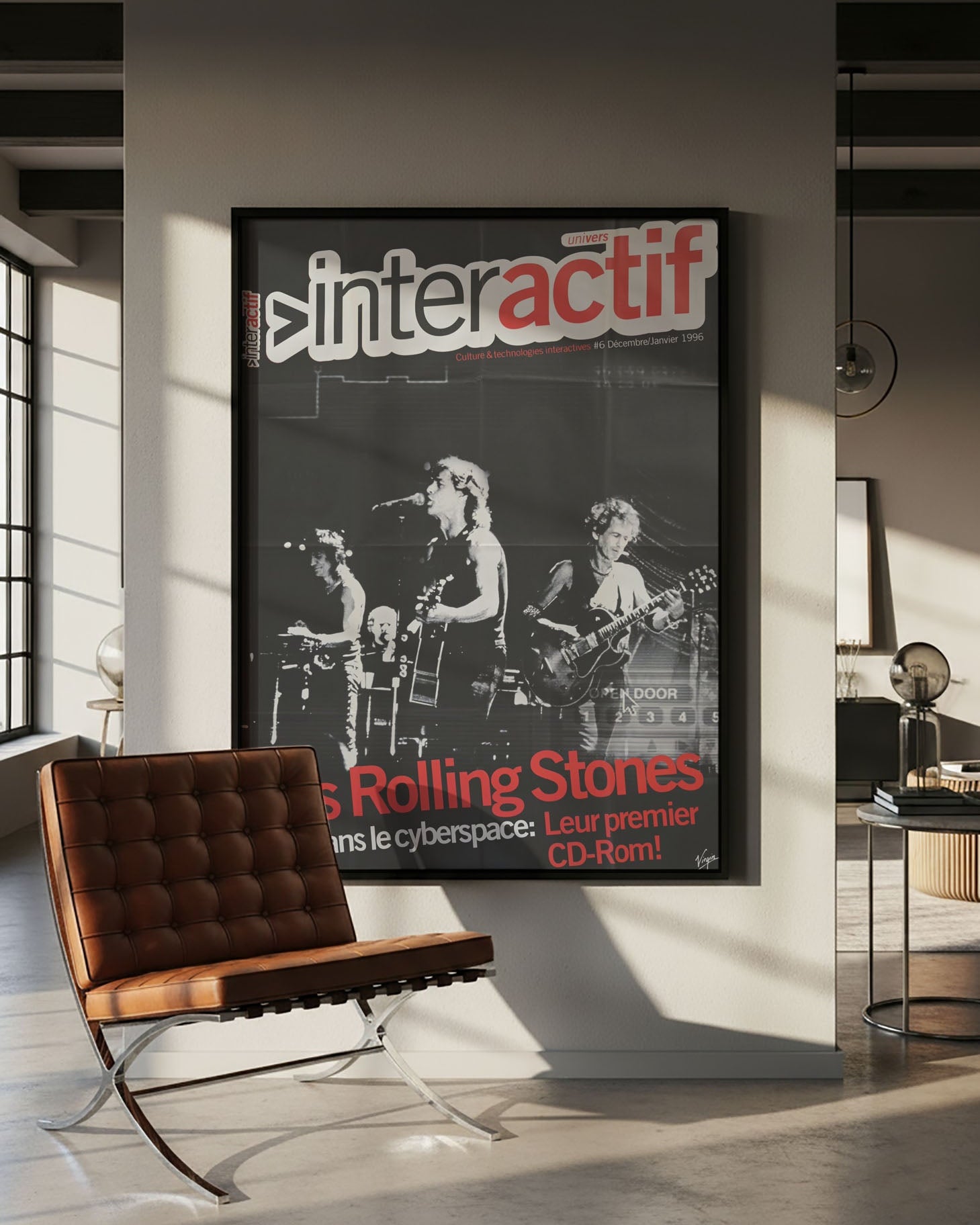 Affiche promotionnelle du magazine « Univers Interactif » (1996), mettant à l’honneur les Rolling Stones en couverture — une image culte des légendes du rock à l’ère numérique.