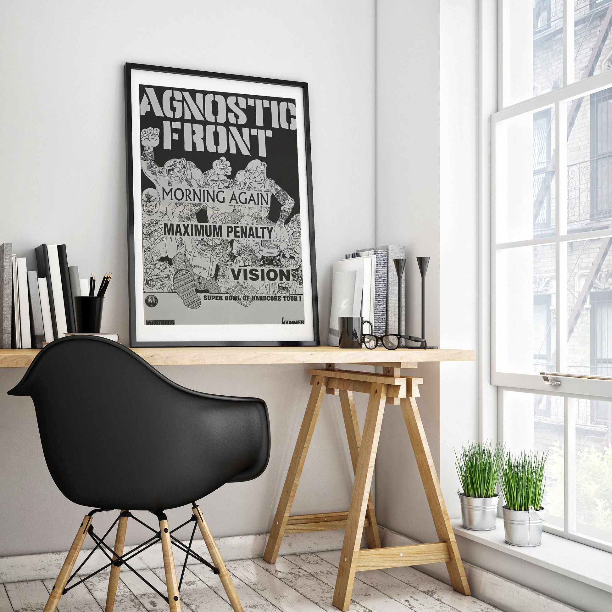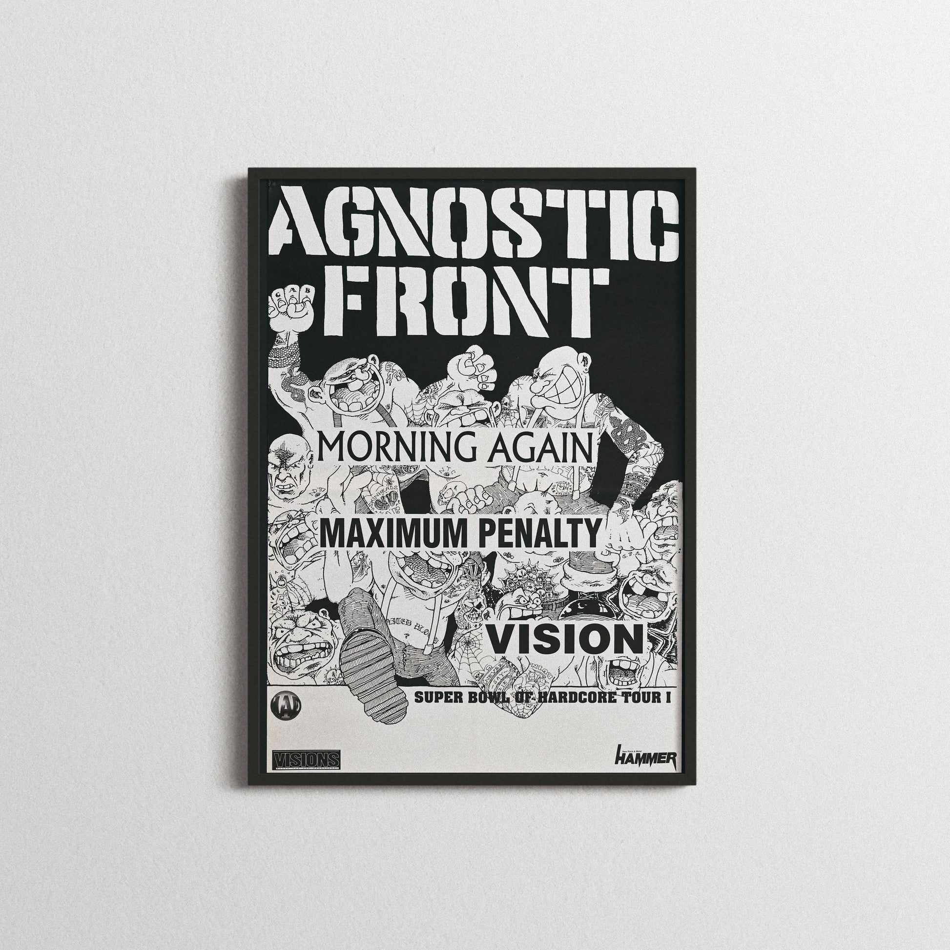 En 1997, le Superbowl Of Hardcore rassemble sur scène les groupes légendaires AGNOSTIC FRONT, MORNING AGAIN et VISION MAXIMUM PENALTY pour une tournée explosive qui a marqué les amateurs de punk et hardcore. Cette affiche capture l'énergie et la passion de cette scène underground qui a influencé toute une génération.